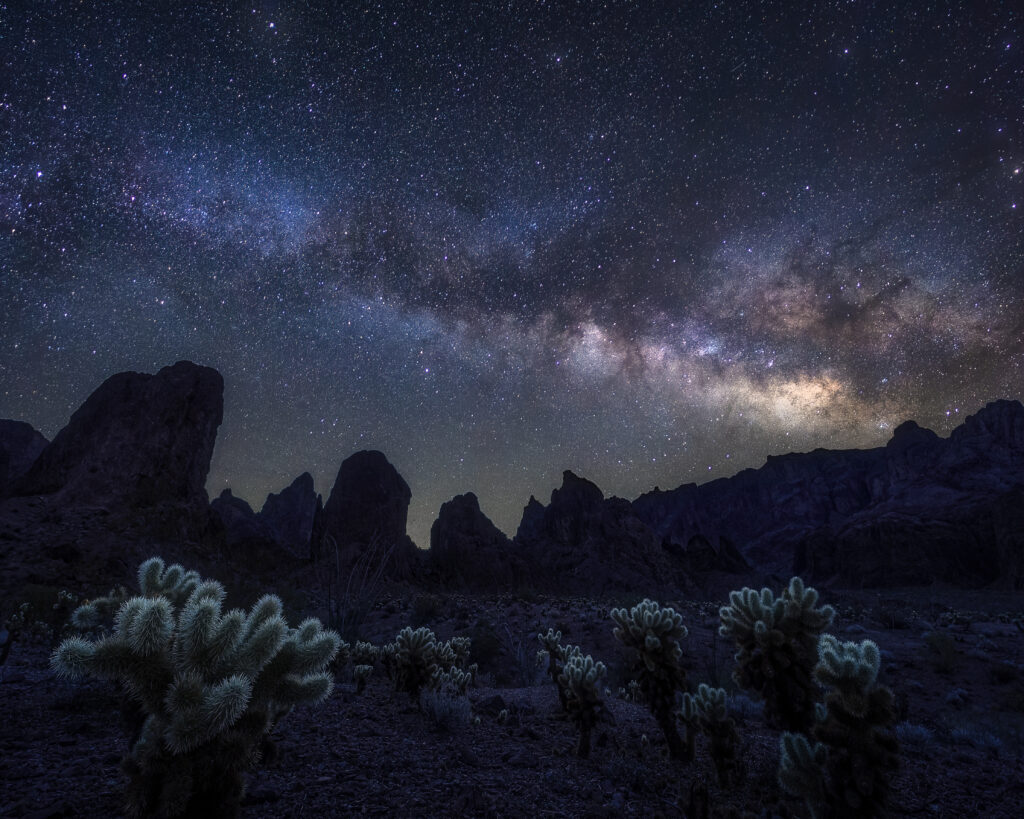 Instead of using starlight or bringing your own light, sometimes you can actually use city light pollution to illuminate your foreground. That’s exactly what I did here—this entire scene, from the cacti to the mountains, is lit by the Phoenix metro area.