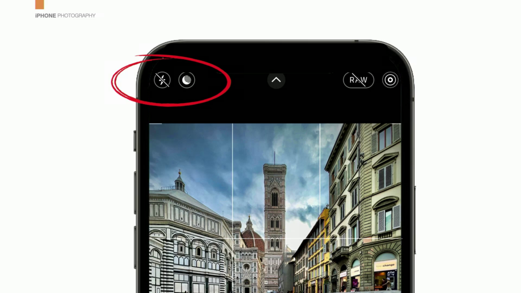 Number one: make darn sure your flash is off. Always. Never, ever, ever, ever, ever use the flash on the back of your camera. I don’t care what the situation is. Look up in the top-left corner and you’ll see the little flash icon—tap it until you see the international symbol for “no flash.”