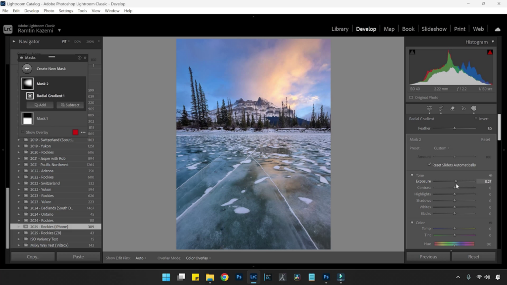 Next, I’ll add a radial gradient where the sun was coming from and increase exposure slightly. I’m not trying to fake light here — I’m just enhancing what was already there.