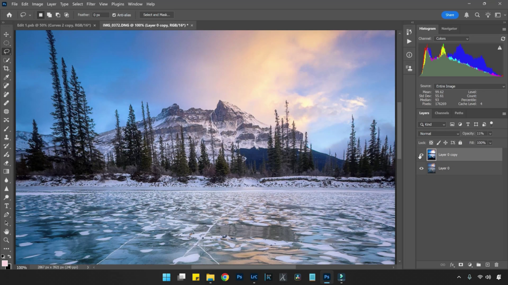 Now I’ll bring this into Photoshop and add a soft Orton effect. I duplicate the layer, apply a Gaussian blur, and then lower the opacity to around 10 or 11 percent. After that, I add a Levels adjustment to bring contrast back.