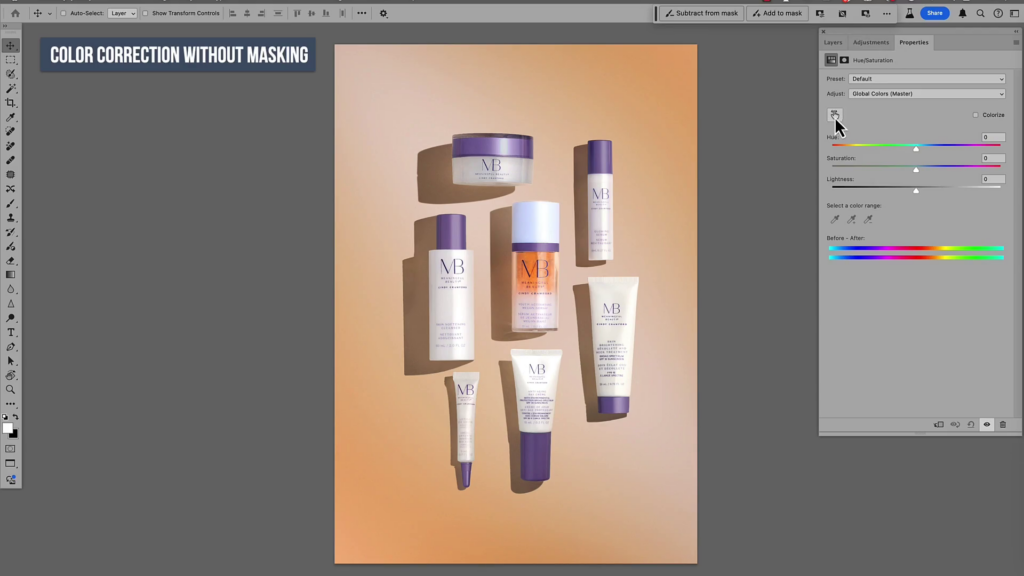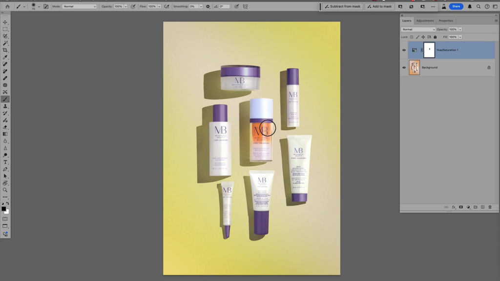 But sometimes, the adjustment bleeds into the product itself. No problem. This is where you bring in a mask. With a black brush, simply paint back the original product while keeping your background shift.
