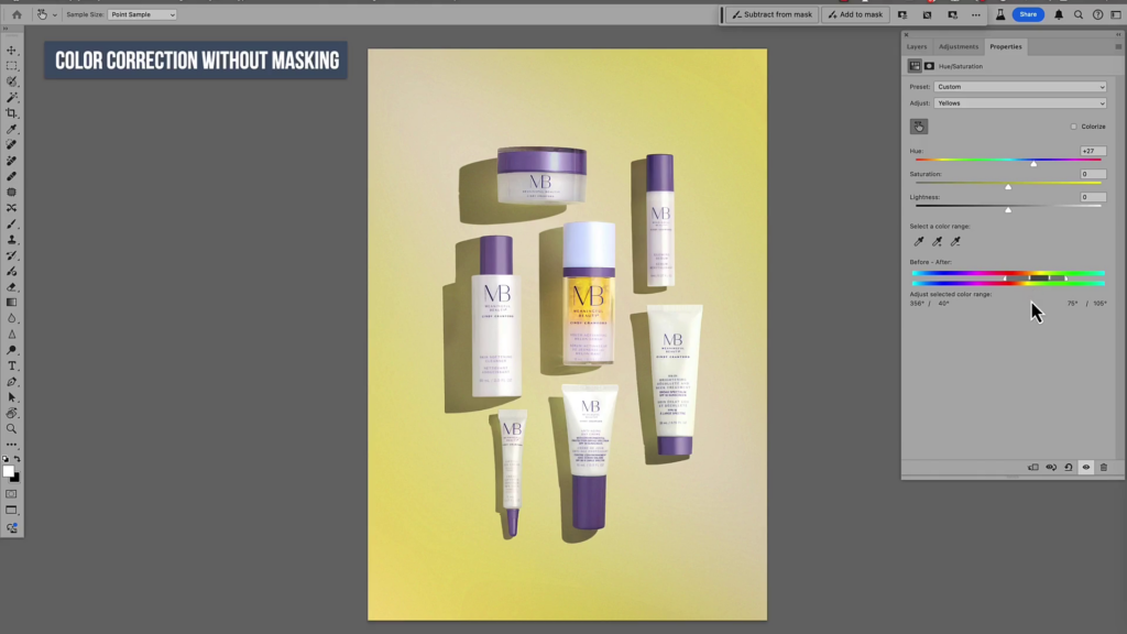 Here’s an important caveat: you need the right source shot. If you start with the green version of a product, you can shift it cleanly. But if you start with a red version and try to shift the reds, too much else in the image changes.