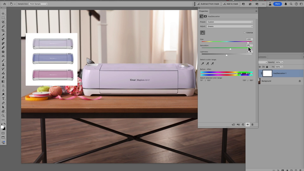 Now I can take this slider here and individually change just the greens to match whatever client color I want. The top bar shows the before color on the range, and the bottom shows the new color. So I’ve effectively said, “Hey Photoshop, make that mint green into purple.”