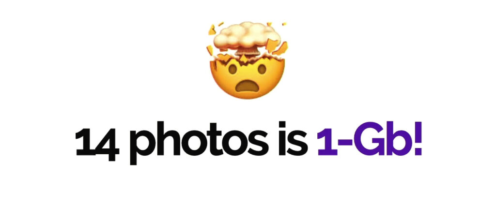 A JPEG is usually around one megabyte. Or Apple uses HEIF compression, which is about one megabyte. That’s nothing. A RAW file is 75 megs. So when in the world would I use that? If I press the button 14 times, that’s a gig. That’s a gig of data for only 14 photos. What if I do a burst and hold it down? Boom—gig. So what I do is I leave my camera set all the time to JPEG.