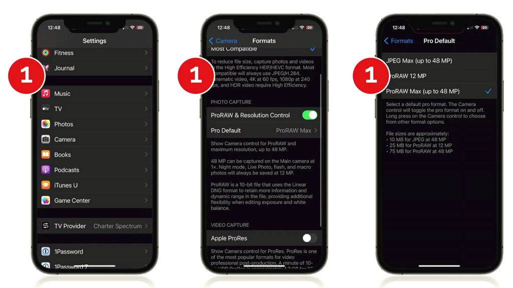 Now here’s the second thing you might want to consider. You don’t have to shoot 48-megapixel RAW. You can do 12-megapixel RAW. It’s a third of the size. It’s still RAW. It’s still ProRAW. But now it’s about 25 megabytes each.