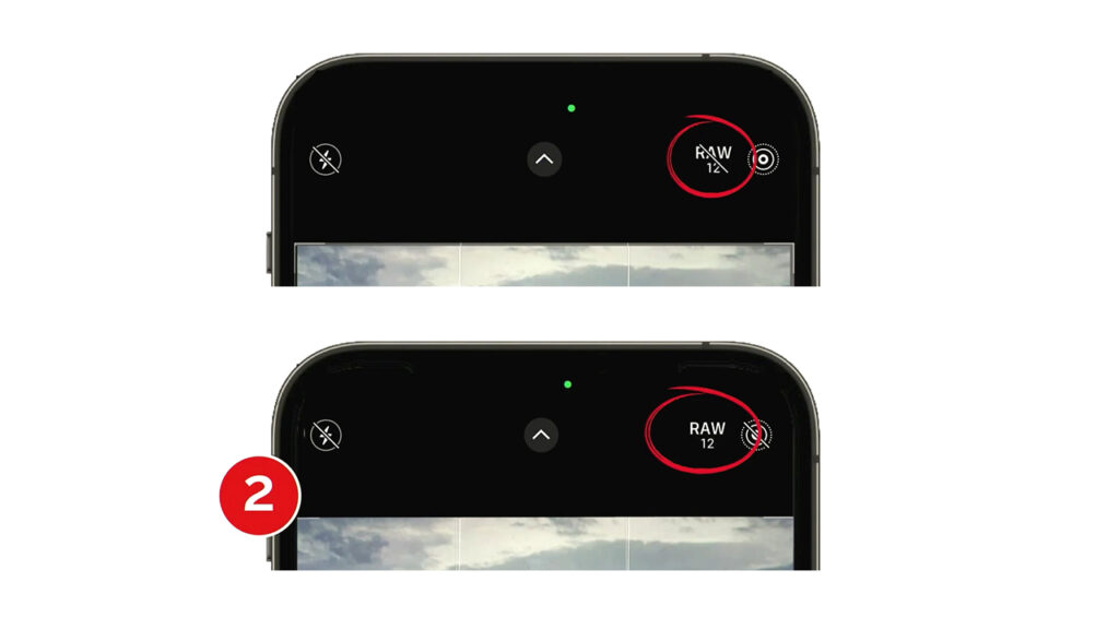 So when you’re ready to shoot RAW, look at the top right corner of your camera screen. You’ll see it says RAW and it says 12. But there’s a line through it. That means you’re still shooting JPEG.