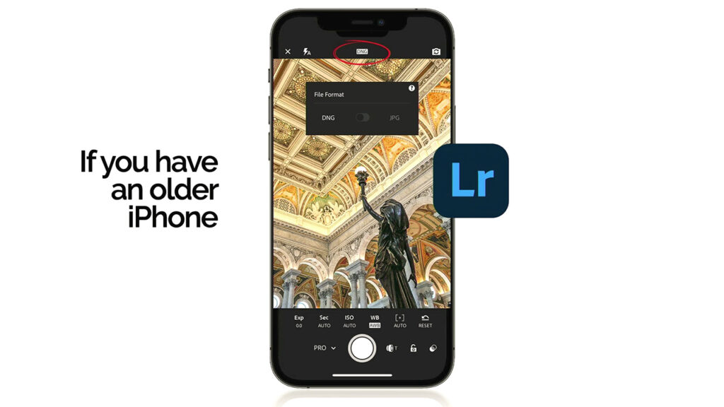 Most iPhones today shoot in RAW. But if you’ve got a model that doesn’t, download Lightroom Mobile. Lightroom Mobile lets you shoot RAW. Just tap up top where it says JPEG. A little file format window pops up. Choose DNG, which is Adobe’s open-source RAW format. Now you’re shooting RAW.